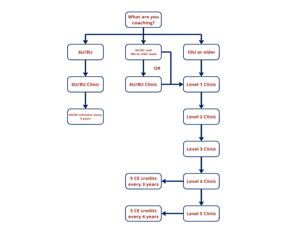 If you are only coaching Mites (6U/8U) and no older age groups, then you just need to complete the 6U/8U Clinic (new as of 2025). If you are coaching Squirts (10U) or older, then you need to begin the progression at Level 1 and you must advance every year until level 4.